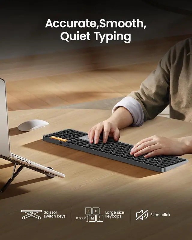 Focus: This backlit bluetooth keyboard boasts a responsive scissor switch, allowing for efficient and hushed typing. The low-profile design and soft-touch keys provide a comfortable typing experience, perfect for maintaining focus ^^ Rechargeable and