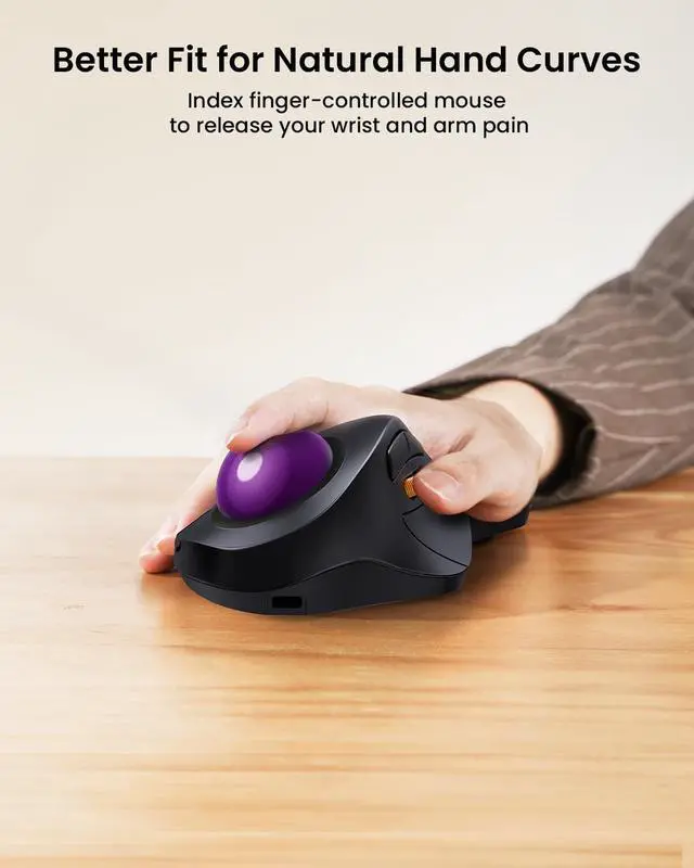 Ergonomic Index Finger Trackball: Our index finger trackball is expertly sculpted to fit your hand naturally, promoting a comfortable, neutral wrist posture and helping to prevent strain and fatigue during long computing sessions. Its 44mm trackball can provide precise control without moving your wrist or arm ^^ Ultimate Connection FreedomPLUG and PLAY. This trackball mouse can connect to up to 3 devices via Bluetooth or USB receiver. Seamlessly switch between 3 devices connect via bluetooth to your laptop and phone, while the included USB receiver links to your desktop or PC. Compatible with Windows, Android, Mac OS, iPad ^^ Quiet Clicking &