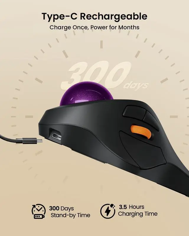 RECHARGEABLE: The Bluetooth Trackball Mouse built-in 930mAh lithium battery. Ditch disposable batteries forever! Enjoy up to 60 days of power on a single full charge for uninterrupted productivity and planet-friendly convenience.