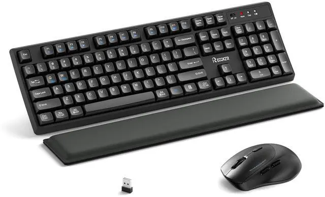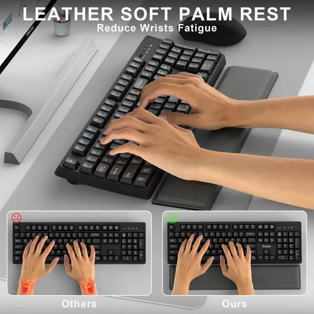 Come with leather soft palm rest, reduce wrists fatigue. For extended comfortable work periods. ^^ Unique Design KeycapUnique design of circular curved concave key cap which match your fingertips, keys shaped like your fingertips for the ultimate smooth and comfortable typing experience. The cambered edge design of the last row key cap reduces stress for a more comfortable experience. ^^ Auto Power Saving FunctionWireless keyboard and mouse have a smart auto-sleep mode to save power. They will enter sleep mode after stop using a while (Refer to the instructions for details). Unplug the receiver or after the PC shutdown, they will enter sleep mode too.