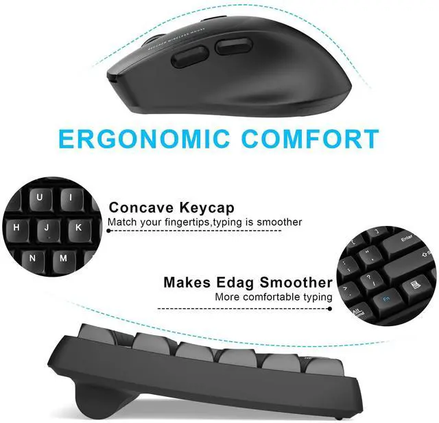 2.4G hz Wireless ConnectionStable and reliable connection of wireless keyboard and mouse is up to 10m (33ft). This combo share a nano USB receiver, no need to take upadditional USB ports (Also the wireless keyboard and mouse can also be used separately). Plug and play, no software needed, convenient and efficient. ^^ Comfortable ComboThe stepped keycap distribution and smooth, curved concave keycaps brings a comfortable typing experience and makes your typing more smooth. Scientific ergonomic design mouse for smoother movement and less overall strain, providing a comfortable using experience like never before.