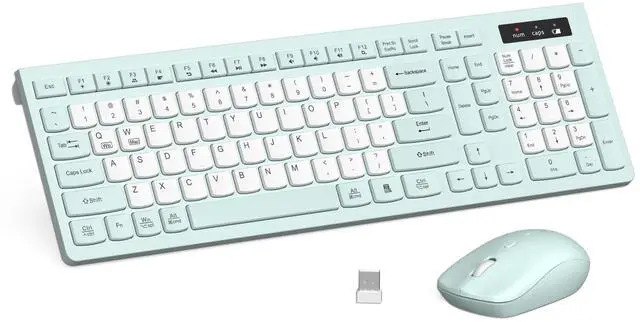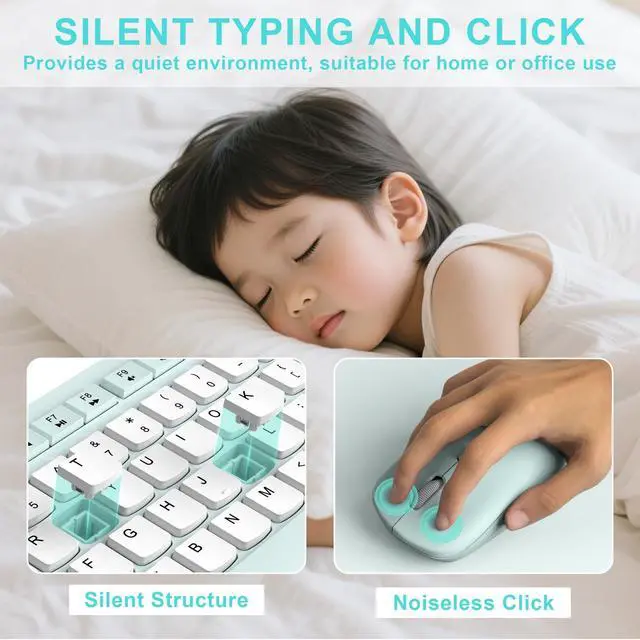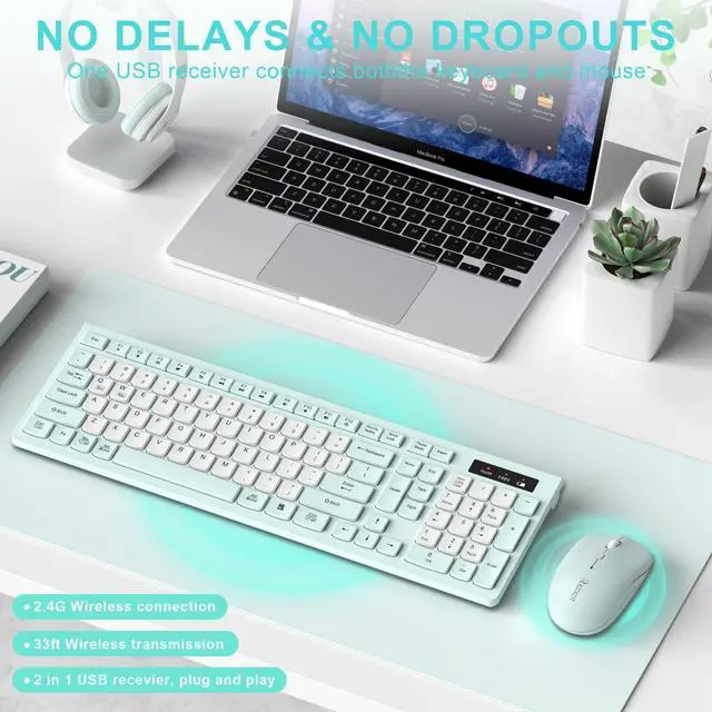 Lag-free & EfficientStable and reliable connection of wireless keyboard and mouse is up to 10m (33ft). This combo share a nano USB receiver, no need to take upadditional USB ports (Also the wireless keyboard and mouse can also be used separately). Plug and play, no software needed, convenient and efficient. ^^ Quiet & Type in ComfortWireless keyboard come with adjustable height tilt legs to increase comfort and prevent your wrists injury when typing for a long time. Our wireless keyboard adopts a silent structure. Soft membrane keys provide a quiet and comfortable typing experience.