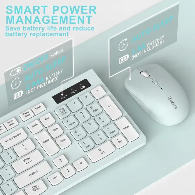 The wireless mouse is quiet without any clicking sound also. So whether at home or in the office, you can use this combo as you please without worrying about disturbing others. ^^ Full Size KeyboardThis keyboard saves desktop space while retaining its full size. The full size wireless keyboard with numeric keypad and 12 multimedia shortcut keys, such as play/ pause, volume increase and decrease, and search, to help you improve work efficiency. ^^ Auto Power Saving FunctionWireless keyboard and mouse have a smart auto-sleep mode to save power for long battery life.