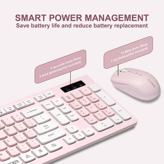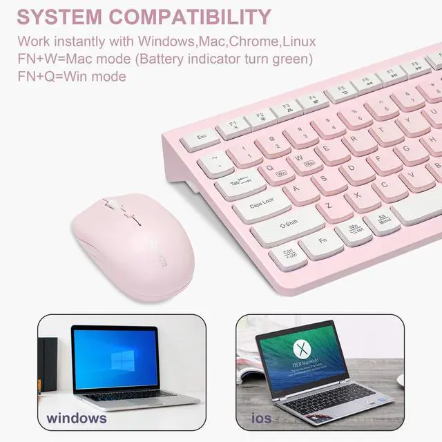 2.4G hz Wireless ConnectionStable and reliable connection of wireless keyboard and mouse is up to 10m (33ft). This combo share a nano USB receiver, no need to take upadditional USB ports (Also the wireless keyboard and mouse can also be used separately). Plug and play, no software needed, convenient and efficient. ^^ Dual-System LayoutSuitable for windows and mac os. Press Fn+Q= Windows mode, Press Fn+W= Mac mode. When you switch to Mac mode, the power indicator light will turn green. ^^ Auto Power Saving FunctionWireless keyboard and mouse have a smart auto-sleep mode to save power.