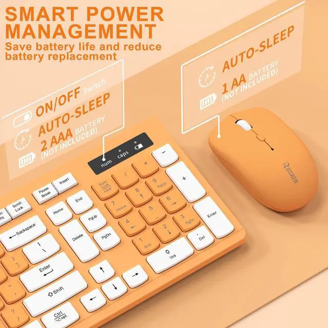 Wireless Keyboard and Mouse Combo, Reccazr 2.4G Full-Sized Keyboard and Mouse Cordless, 3 DPI Adjustable Mouse, Dual-System Keyboard for Computer/Laptop/Windows/Mac (Orange-A)