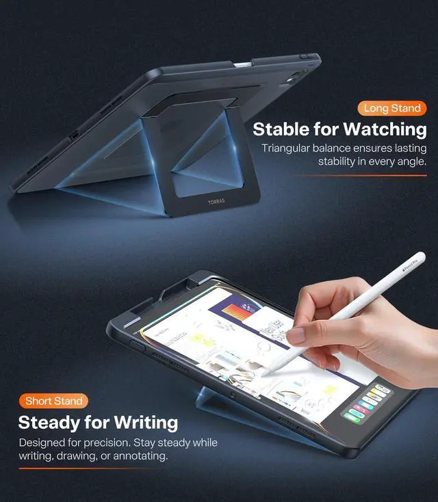 UNBEATABLE STURDINESS & STABILITY: Say goodbye to shaky cases! TORRAS Ostand iPad Pro 12.9 Case is a real game-changer to boost your productivity. Its dual stands are made of aviation aluminum and use the exclusive Tora-Hold tech enhances hinge damping. It's extremely solid, passing over 30, 000 durability tests and giving your iPad super stable support. No more shakes or collapses like traditional leather cases. Confidently create with it.