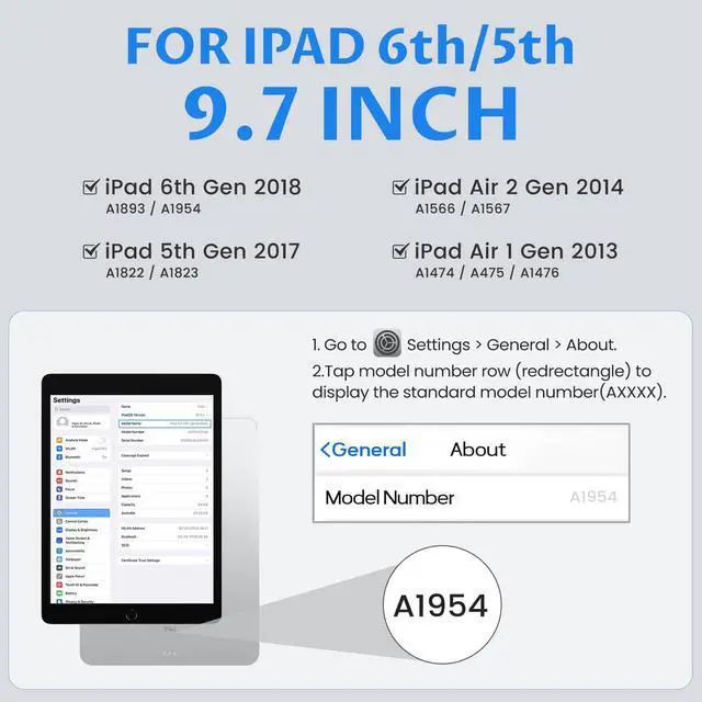 For ipad 6th generation case with keyboardCompatible wifh iPad 9.7 inch 6th generation -A1893/A1954; iPad 9.7 inch 5th generation -A1822/A1823; iPad Air 2nd generation -A1566/A1567; Note: Please check the bottom of the back of your iPad to confirm the model number "AXXXX" before purchasing to prevent size errors
