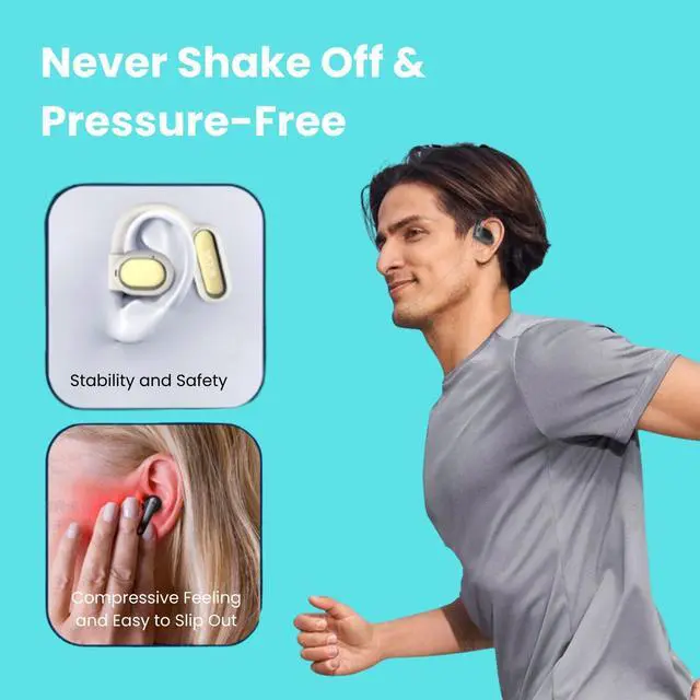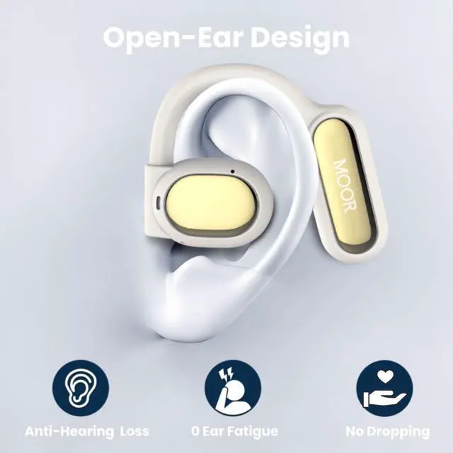 Ergonomic Open Ear DesignFeaturing a true open-ear design that allows the earbuds to rest gently on the top of the ear without stuffing the ear canal. Combined with the lightweight build (12.7g each), they effectively prevent common issues associated with in-ear headphones, such as discomfort and hearing issues from extended use.