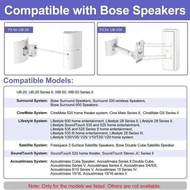 ---Compatible---Ceiling mount /wall mount bracket for Bose UB-20, UB-20 Series II, WB-50 Series II, UFS-20 Series II, UTS-20 Series II- For Bose Surround Speakers, Lifestyle 600 home entertainment system- For CineMate 520, CM520, Cine Mate Series II, GS Series II, Virtually Invisible 300- For Lifestyle SoundTouch 300 535 525 520 600 535III 525III ST535 ST525 ST520 home system, Stereo JC Series II Wi-Fi music system