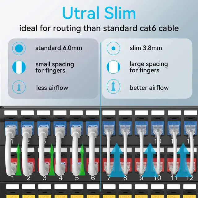 Utral Slim: Cat6A ethernet patch cable stands out for its slim design. Cat6 patch cables is ideal for routing in tight spaces, easy to trace specific cables and much better airflow, compaired with regular patch cables cat6.