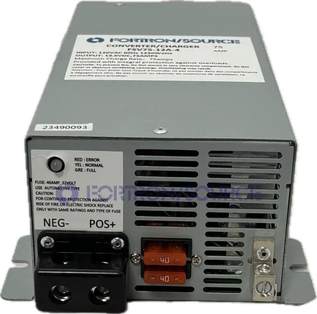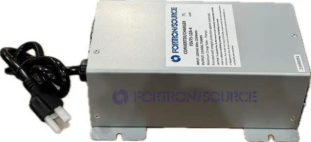 The Fortron/Source 4-Stage Recreational Vehicle Power Supply provides consistent and reliable power to your RV INPUT CHARACTERISTICS AC Input Voltage Rating 120 Vac Range 105-130 Vac AC Input Current Inrush Current <75A @120Vac Power Factor N/A OUTPUT CHARACTERISTICS Output Voltage 13.75 Vdc Output Voltage Range 13.2 - 14.4 Vdc Output Power Efficiency Typical values 80% @ 120 Vac Hold-Up Time 20ms @120Vac Startup Time 1000mS Max Load Regulation 1%Vdc Line Regulation 0.5 %Vdc Three Charging BULK, NORMAL, FLOAT Over Load Protection 105-120%, Auto resetting Short Circuit Protection Continuous, Auto resetting Over Voltage Protection 115-125%, Auto resetting Overtemp