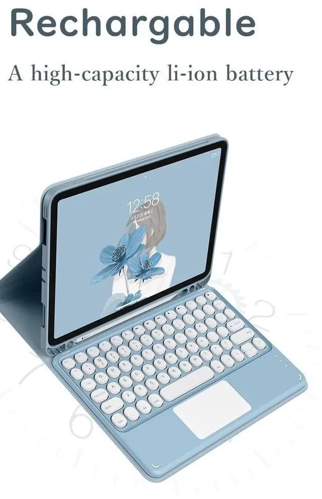 Round key cap + Magnetically detachable color keyboard The latest design in 2021, Stylish and cute color keyboard with round keys, The magnetic separate keyboard is suitable for 3 systems of WindowsAndroidiOS, Not only can be used with iPad, It can also be used with other tablet computers and mobile phones.