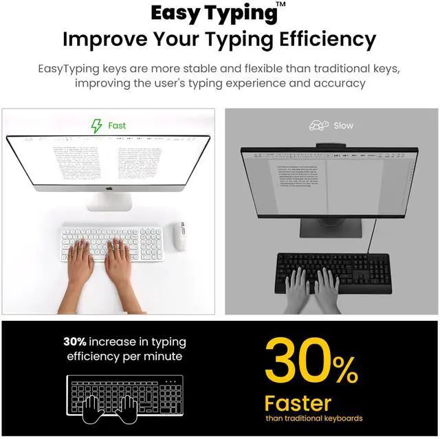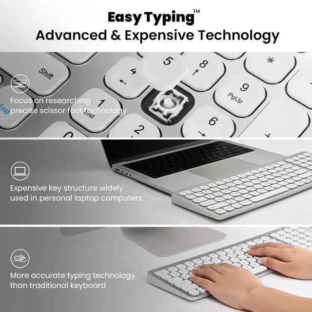 Slim and Ergonomic Design The slim keyboard has a tilt angle for the great typing position.Sweat-resistant, skin-friendly finish wireless mouse in contoured shape would provide hours of work comfortably. The full size keyboard type fast with numeric keypad and instant