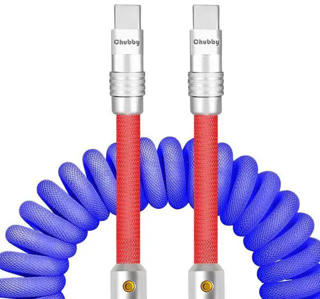 chubbycable Curly Chubby - 240W Coiled USB C Cable Spring Retractable Fast Charging Cable for Car Compatible with CarPlay, Android Auto, Red+Dark Blue, Type-C to Type-C, 2.29FT-3.6FT