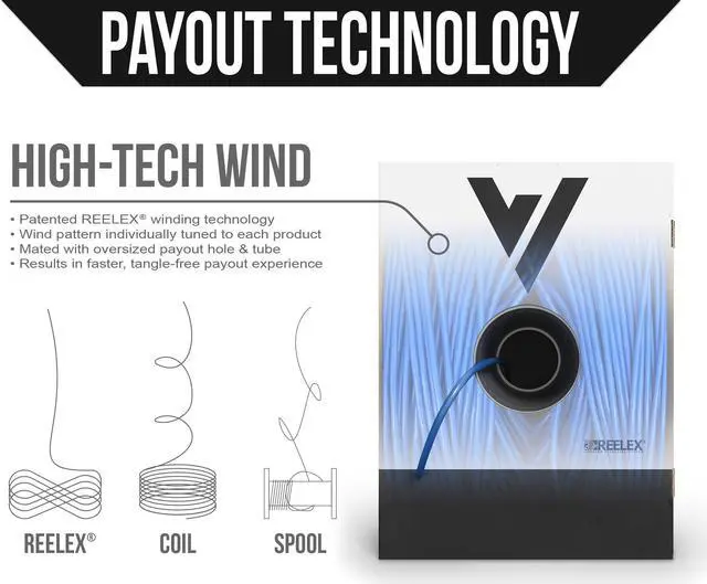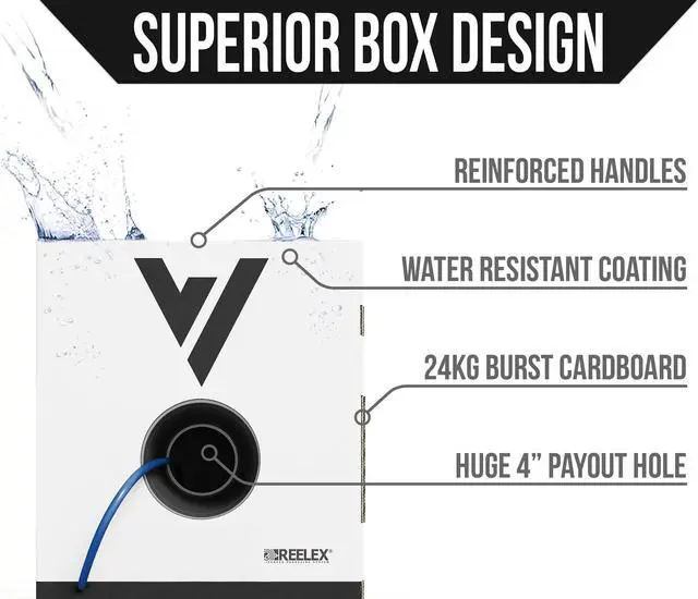 TIME SAVING FEATURES. Patented winding technology & massive payout hole eliminate kinks and tangles. Reinforced handles, super-durable cardboard, & water resistant coating keep the box intact. Jacket