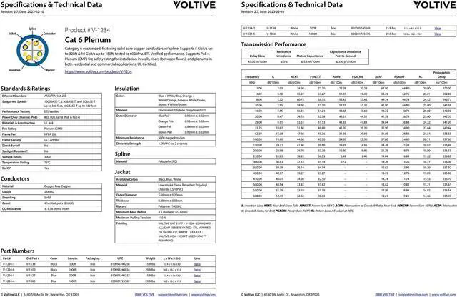 STANDARDS & WARRANTY. Performance (ETL Verified): ANSI/TIA-568.2-D, ISO/IEC 11801-1, IEC 61156-5. Power over Ethernet: IEEE 802.3af/at. Fire safety: NFPA 262. Construction: UL 444, CSA 22.2 No. 214, RoHS. Includes Voltive 20 year warranty.