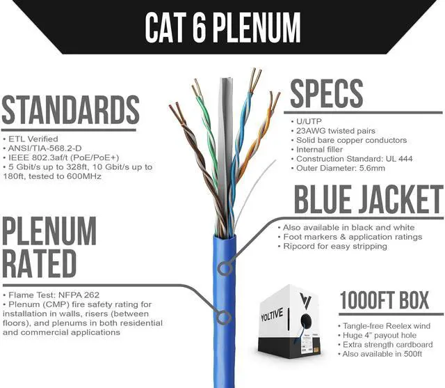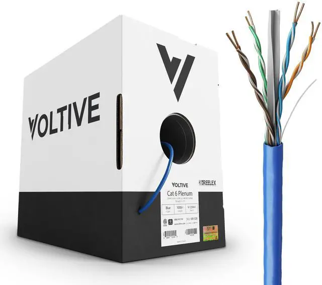 Voltive Cat6 Plenum (CMP), 1000ft, Blue - Solid Bare Copper Bulk Ethernet Cable - UTP - 600MHz - UL Certified & ETL Verified