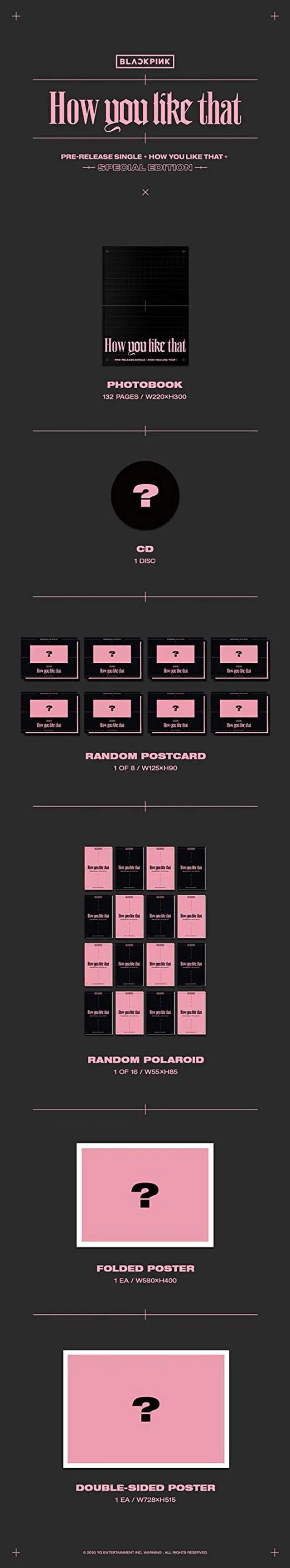 Black Pink - [How You Like That] Special Edition Single Album package includes CD+1p Folded Poster On Pack+132p Photo Book+1p Post Card+1p Polaroid +Extra Message Photo Card SET+Free Tracking Number. "Officially distributed Brand New & Factory Sealed CD. " "Your purchase quantity will be count on Korea HANTEO & GAON Chart! " Track List Disk (CD). 01 01. How You Like That 02. How You Like That (inst. )