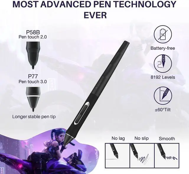 Upgraded Pen Technology: P77 battery-free stylus adopts new pressure-sensitive pen technology, which shortens the distance from the pen tip to the display for a precise line positioning to achieve the effect of real pen writing. Features 8192 pressure sensitivity, support ±60° tilt, and 5080LPI handwriting resolution. The ergonomic gravity balance design gives users a professional and comfortable feel, you can easily get smooth and accurate lines
