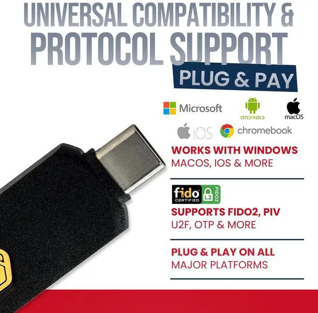 Works instantly across desktops, laptops, and mobile with plug-and-play USB-C and tap-to-authenticate NFC. No software or drivers required. Enables secure logins without passwords, batteries, or network connections on Windows PC, MacBook, iPhone, Android Phone, Chrome Book and major browsers.