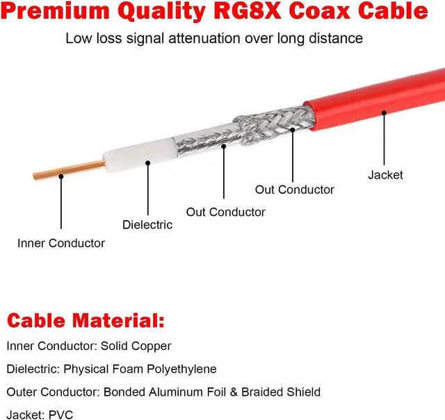 Low Loss RG8X Cable -- MOOKEERF RG8X Coaxial Cable is made with pure copper inner conductor, with double shielding to prevent signal leakage,interference and signal loss.It could support better signal transfer with minimum signal loss over large distances and higher frequency use.
