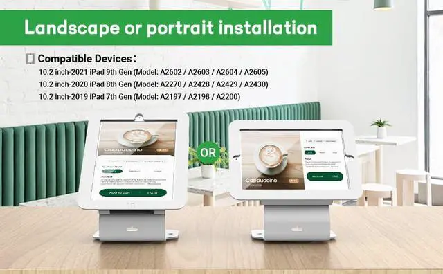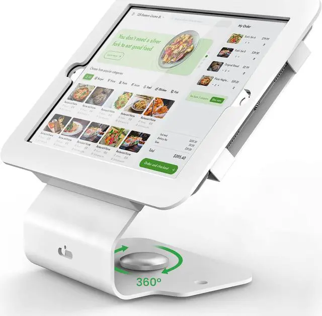 360° ROTATION BASE: Commercial iPad tablet stand with 360° swivel base, displaying conveniently between cashier and customer.