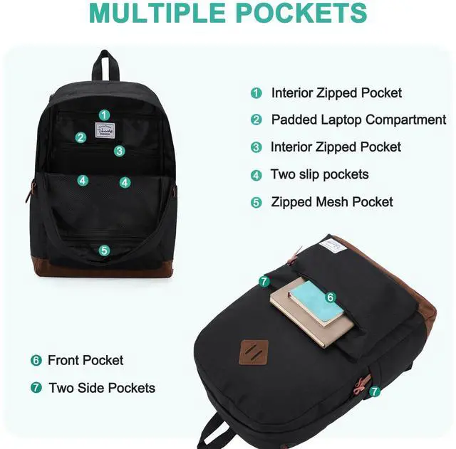 EASY TO ORGANIZE:Main compartment with double-zipper closure;One exterior zipper pocket; Water-bottle pockets on both sides,padded Ipad/Laptop pocket fits up to 15inch laptop,4 interior zipper pockets,leather zipper puller,adjustable padded Reinforced Strap ,anti-theft back pocket.