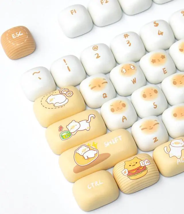 Bread Cat Keycaps Set: The yellow white rounded keycap set is printed with cute cat patterns on each keycap, the cute butter kitten provides you with different emotional feedback with every typing, feeling a wonderful experience of communicating with it, making your mood happy and adding a little cute element to your keyboard settings.