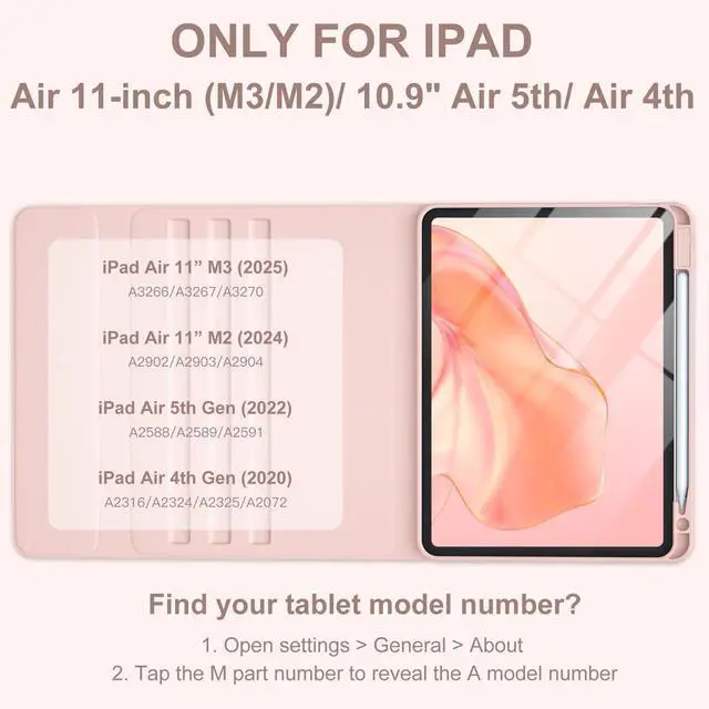 CompatibilityThis air keyboard case is compatible for iPad Air 11-inch (M3) 2025 (Model Number: A2902/AA2903/A2904), for iPad Air 11-inch (M2) 2024 (Model Number: A3266/A3267/A3270), for iPad Air 5th Generation (Model Number: A2588/A2589/A2591), for iPad Air 4th Generation 10.9 inch (Model Number: A2316/A2324/A2325/A2072). Not for other devices. Please be kindly check the model number No. starting with the letter "A" of your tablet back before order