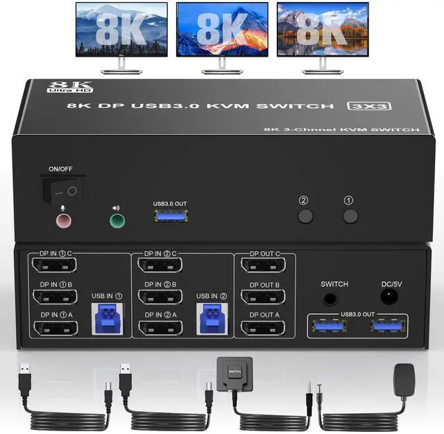 Ultra HD 8K@60Hz KVM Switch Triple Monitor: The 3 DisplayPort kvm switch supports resolution up to 8K@60Hz and downwards. Please be reminded it only when both your computer Graphics card and monitor support 8K@60Hz then you can get 8K effect.
