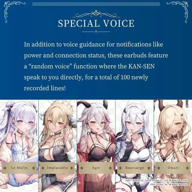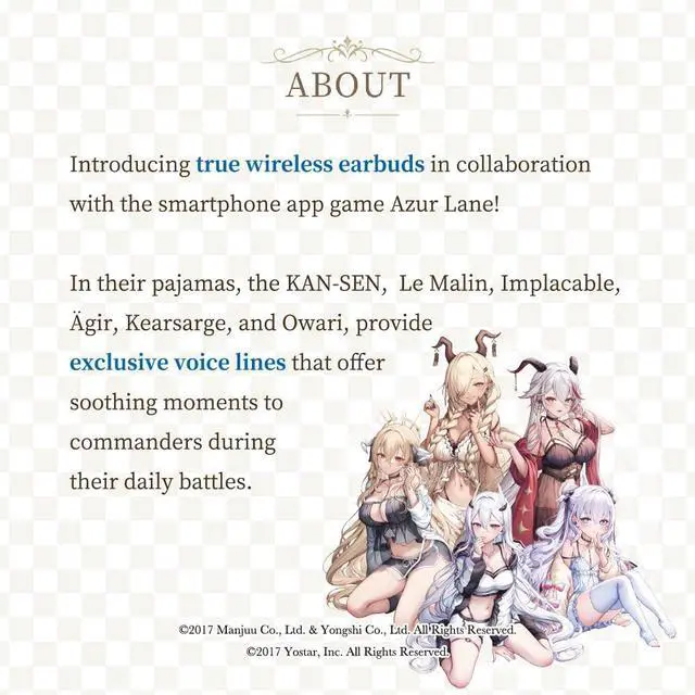 Introducing true wireless earbuds in collaboration with the smartphone app game Azur Lane! In their pajamas, the KAN-SEN, Le Malin, Implacable, Ägir, Kearsarge, and Owari, provide exclusive voice lines that offer soothing moments to commanders during their daily battles.