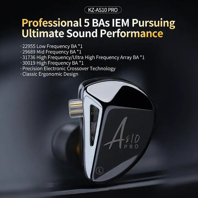 Ultimate sound performance: The KZ-AS10 PRO professional 5 balanced armature in-ear headphones pursue ultimate sound performance. Equipped with a variety of high-performance balanced armature units, including the 22955 low-frequency unit, 29689 mid-frequency unit, 31736 high-frequency/ultra-high frequency array unit, and 30019 high-frequency unit. The precision electronic crossover technology ensures that every note is accurately presented, bringing an unparalleled sound quality experience.