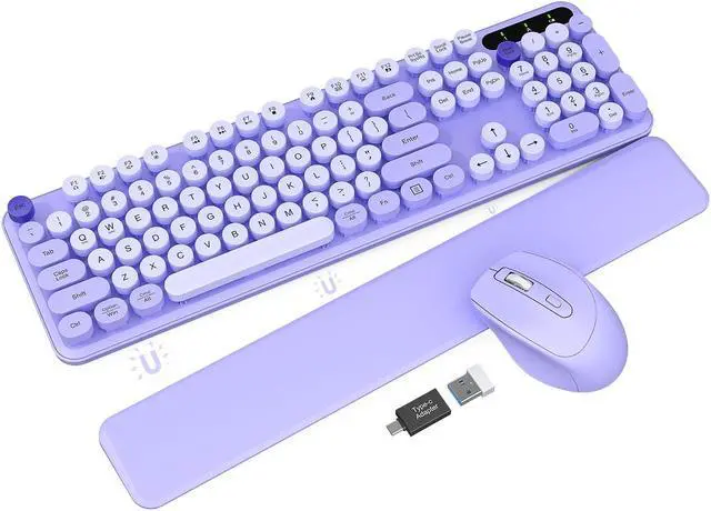 Wireless Keyboard and Mouse Combo - Cute Typewriter Keyboard with Detachable Wrist Rest, Retro Round Keycaps, Foldable Legs, 2.4GH z Full-Size Keyboard for PC, Laptop, Mac, Windows - Trueque (Purple)