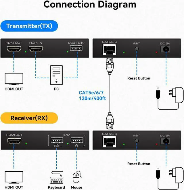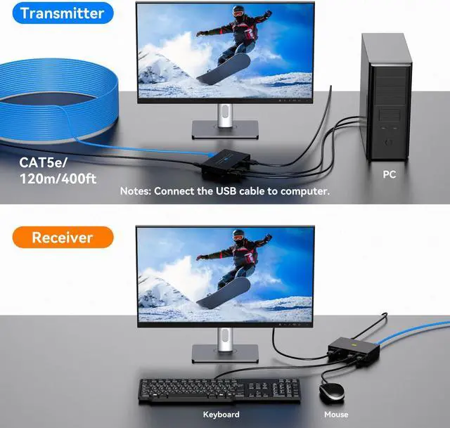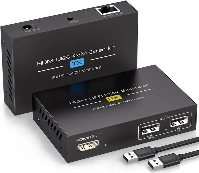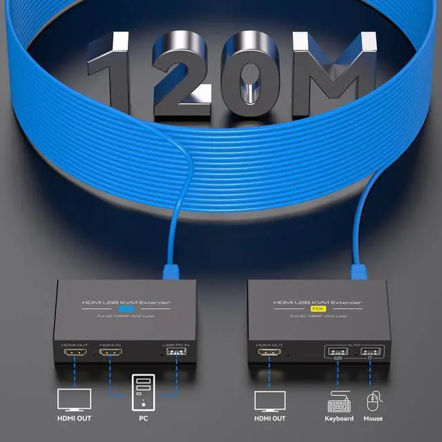 • KVM ExtenderThis KVM Extender over cat 5e/6/7 cable transmits HDMI signals and USB data up to 394 feet (120 metres), and connects a mouse and keyboard on the receiving end (RX) to remotely control a computer on the sending end (RX). (Network cable requires IEEE-568B compliance).