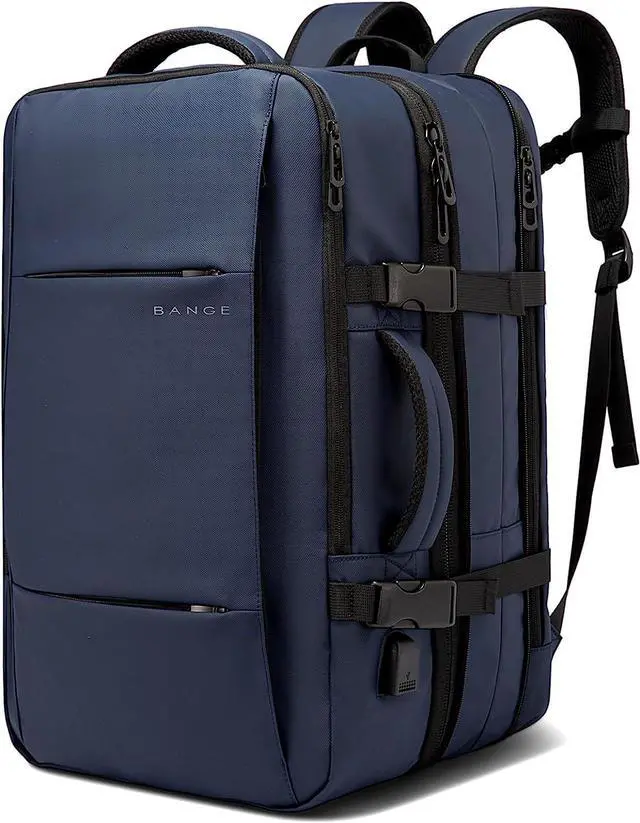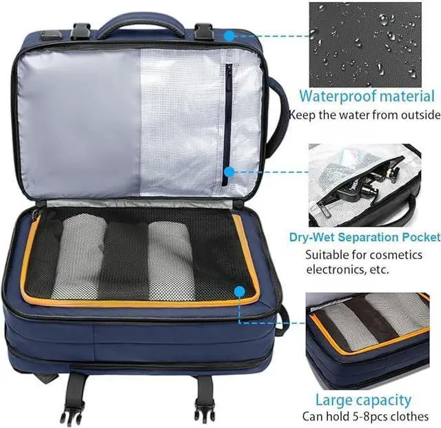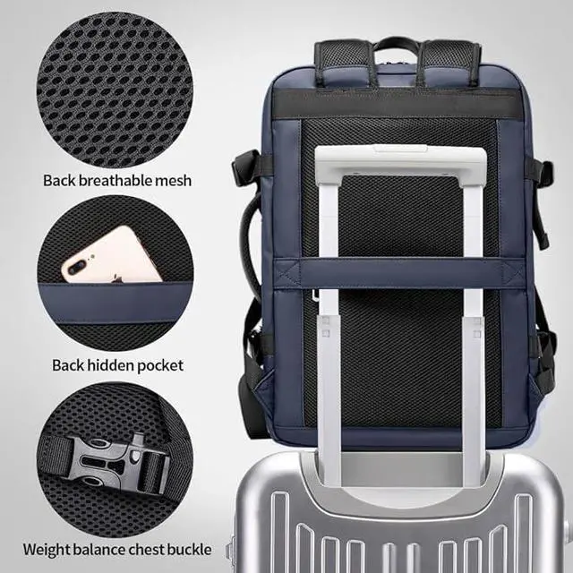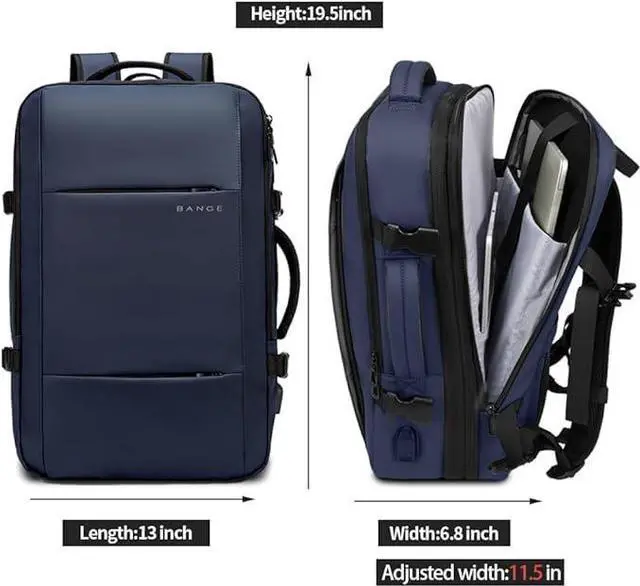 LARGE CAPACITY EASY TO CARRY-ON:The backpack with many compartments, organization and expansion.The main pocket can hold your travel goods,fit 5-8pcs clothes. It is cool that there is a wet pouch to liquids.Front compartment can also hold magazines,Ipad and power bank which can charge your phone. 19inch laptop compartment size: 16.5" x 11.8" (please cheak your laptop size),Backpack Back with padded batter can protect your laptop.