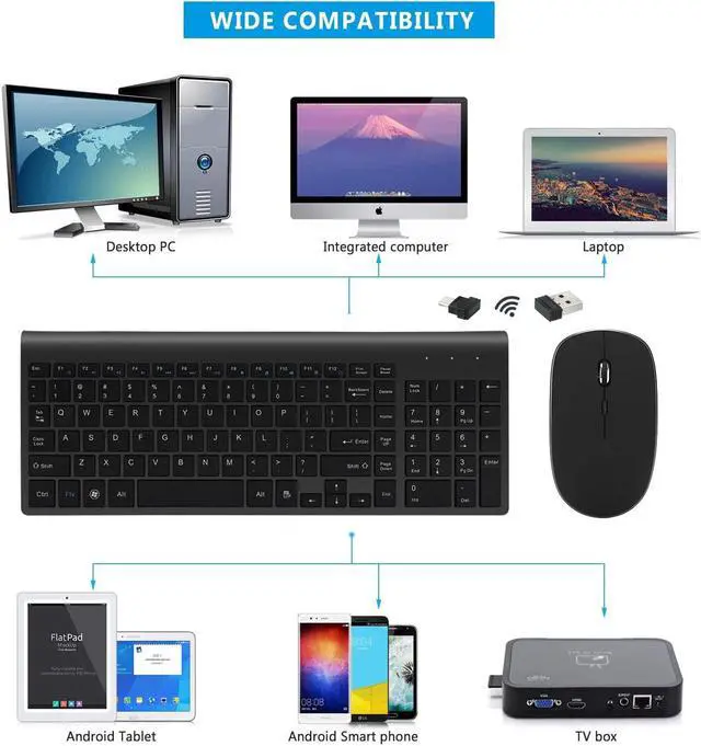 Quick view: Full size 104 keys keyboard and the precise DPI adjustable mouse, you can totally handle any task at home/office. Enjoy its great convenience and improve your work efficiency with this amazing wireless keyboard and mouse combo.