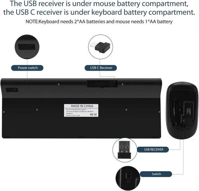 Package including: 1 Wireless keyboard 1Wireless mouse 1 USB A receiver 1USB C receiver