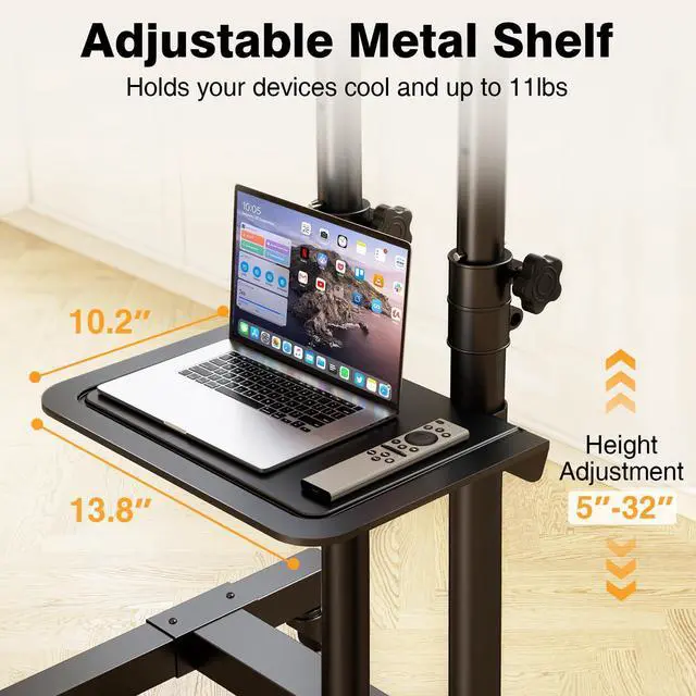 Height Adjustable : TV rolling stand has 15 steps height adjustable option, height from 44'' to 64" (The height includes the mount and hook.). Besides, portable tv stand with middle metal shelf what can be adjusted freely, offers more space to hold A/V equipment like games monitor, tablets, cable box, laptops etc.