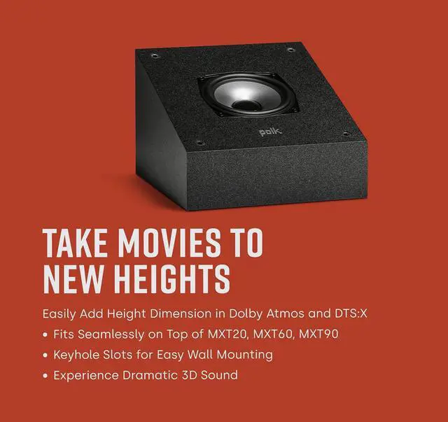 DTS: X compatible. Sold as pairs, the MXT90 height speakers can be easily placed on Monitor MXT20 bookshelf speakers, MXT60 and MXT70 floor-standing speakers or wall mounted using their sturdy keyhole slot. Elevate any home configuration and get extraordinary sound reproduction from any part of the room.