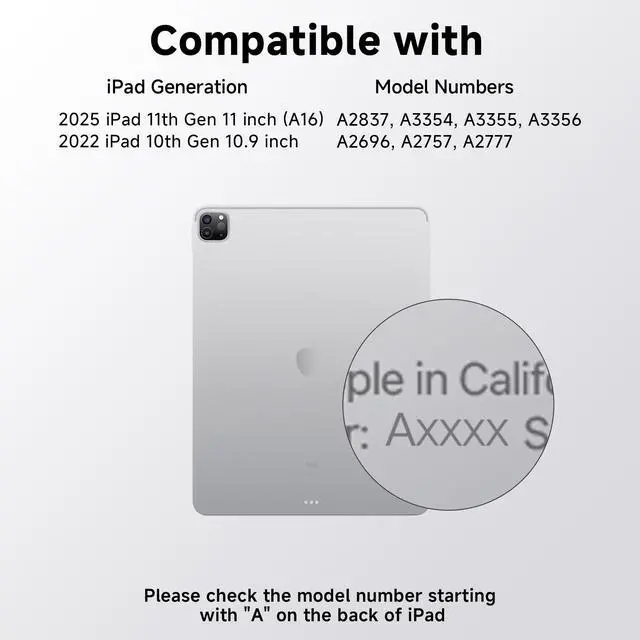 Compatibility: swivel ipad case with keyboard Perfectly designed for the iPad 11th(A16,2025)/10th Generation; models A2696, A2757, A2777,Prior to purchase, verify the iPad model number (denoted by the prefix "A" on the device's rear casing) to ensure compatibility.