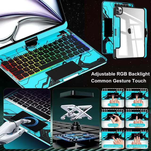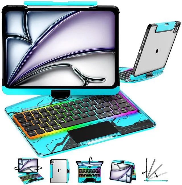 CNAIDUNR Transparent 360°Rotatable Keyboard Case for 2024 iPad Pro 13-in. (M4), Clear Hard PC Back, Trackpad, Pencil Holder, 7 Color Backlight, Blue