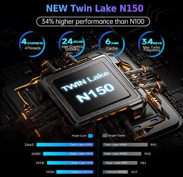 Newest Light Office Mini PC, OUMAX mini pc is equipped with 13th Gen Twin Lake N150 processor, 4 cores, 4 threads, 6 MB L3 Cache, up to 3.6 GHz. Performance is 34 % higher than N100. Fast and smooth mini pc is ideal for office work, online meetings, HTPC, home server