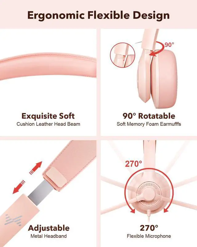JIAMQISHI USB Headset with Microphone for PC, On-Ear Computer Laptop Headphones with Noise Cancelling Mic in-line Control for Home Office Online Class Zoom (USB+3.5mm, Pink)