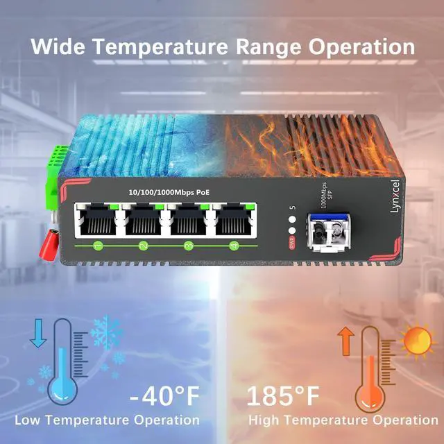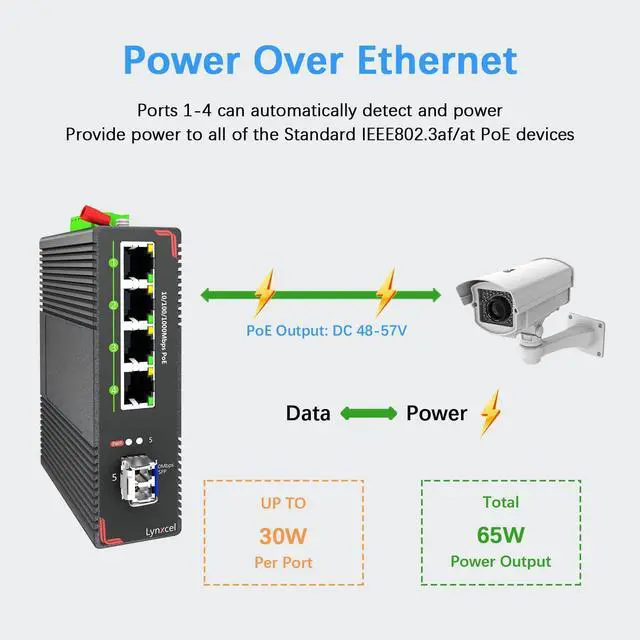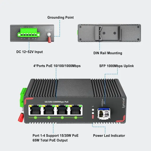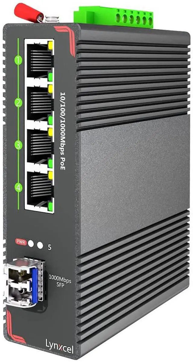 Lynxcel 5-Port Industrial PoE Gigabit Din Rail Ethernet Switch, 4 x Gigabit PoE+ Ports, 65W PoE 48V Output, 1 x SFP Gigabit Slot with One Gigabit SFP LC Module, IP40 Unmanaged, with Power Supply