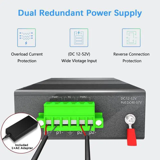 Dual Redundant Power InputThis unmanaged industrial ethernet switch can automatic fault switching, with anti-overload protection, anti-reverse connection protection, will not damage the equipment. Power Input Voltage 12-52V DC.