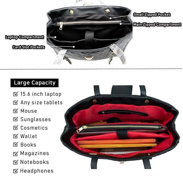 Quilted Laptop Bag for Women, 15.6 inch PU Leather Shoulder Purse Tote Business Office Messenger Casual Handbag (Black with Gray Snake)