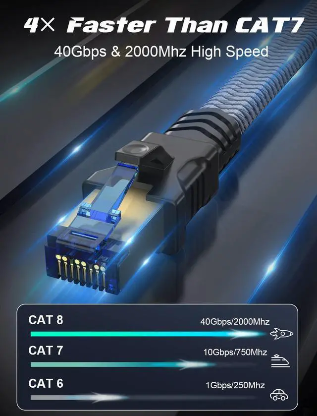 Premium S/FTP Structure - Cat8 internet cable is made of 4 shielded foiled twisted pair (S/FTP) and 100% OFC wires (26AWG) with a gold plated RJ45 connector on each end, It's efficient in reducing EMI/RFI Interference and provide highest fidelity for 100FT long distance data transmission. Cat8 cable is a lot faster and stable in data transfer when compared with other 32AWG Ethernet cables.