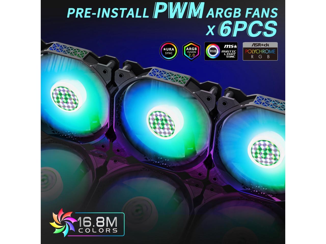 - 6 Highly Configurable PWM ARGB Fans Pre-installed- (1) Ensure your motherboard has a 3PIN rgb interface and use the motherboard lighting software to control the fans, each addressable ARGB fan can offer 16.8 million colors of special customizable lighting. (2) Adjustable speed PWM fans allow pc case for better silence and better cooling depending on demand. Also the fan with new upgraded bearings greatly extends the service life. Easy disassembly operation facilitates PC hardware assembly.