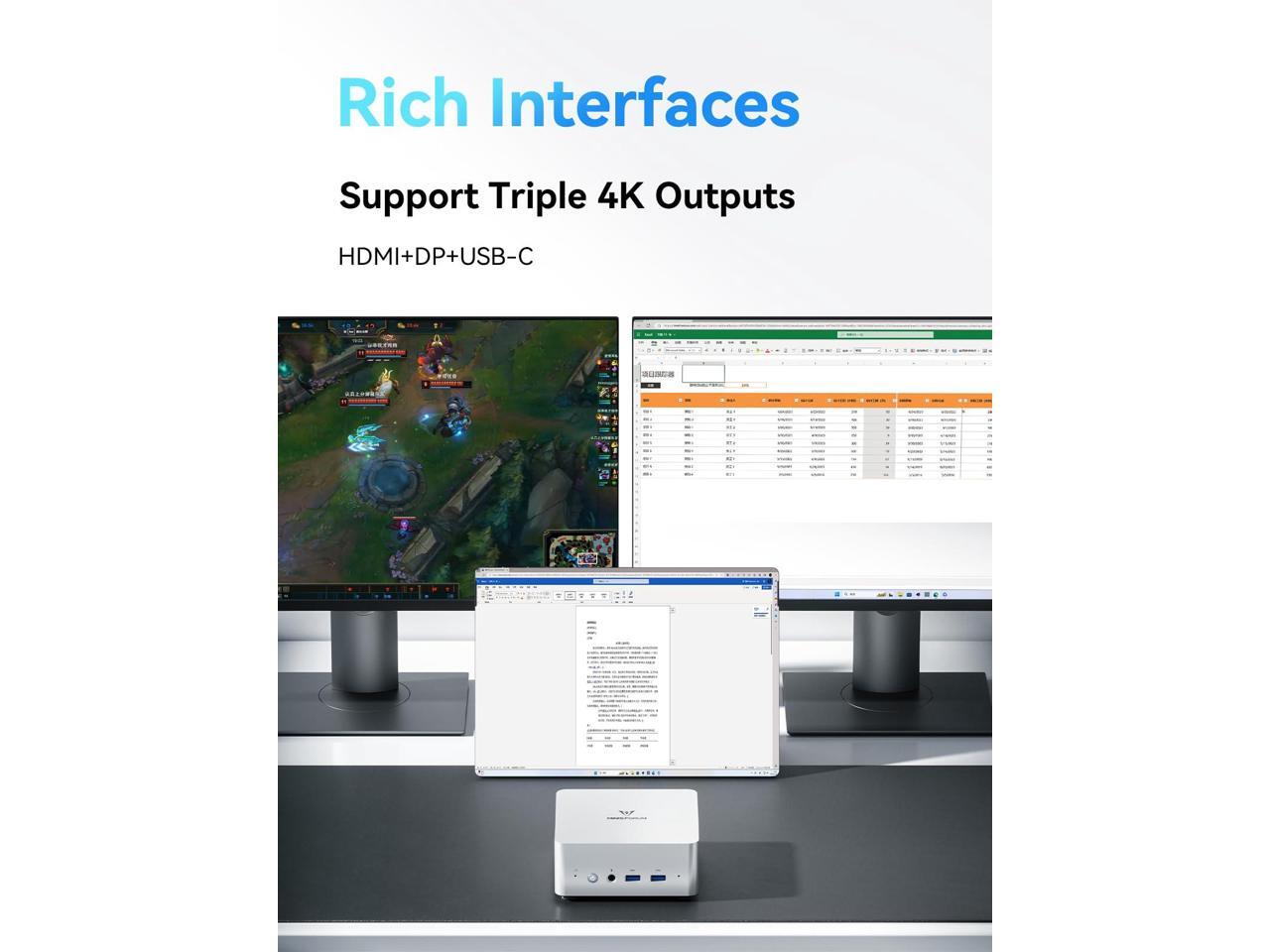 - Triple Display ConnectivityThis i9 Mini PC is equipped with HDMI, DisplayPort, and USB-C (4K@60Hz) video outputs, enabling simultaneous connection to three ultra-HD displays for an expanded and immersive viewing experience that significantly enhances work efficiency by providing multiple workspaces.