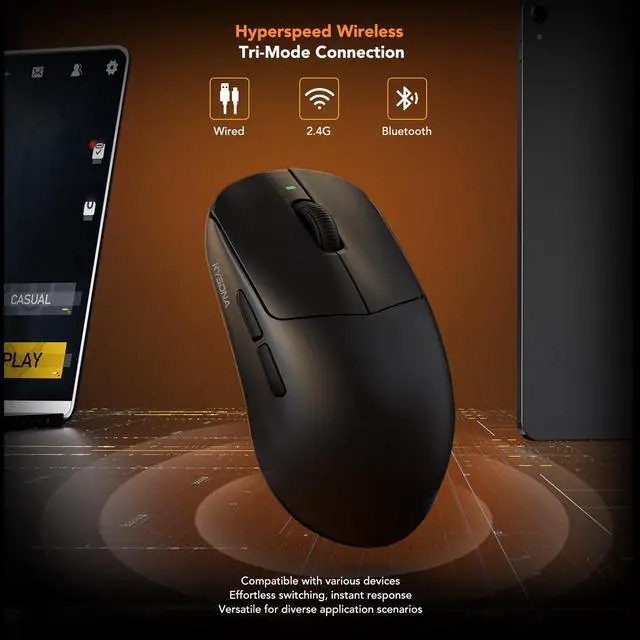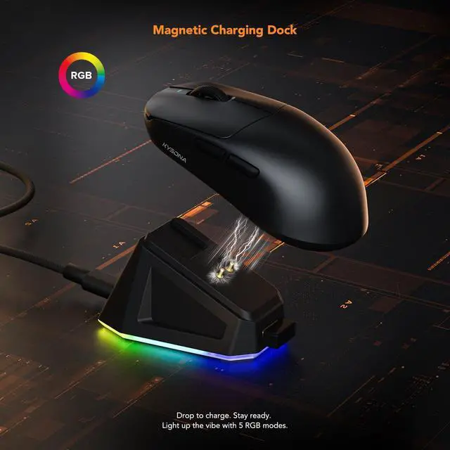 KYSONA Wireless Gaming Mouse with Charging DockLightweight 42g, 24000 DPI, Wired/Bluetooth/ 2.4G Optical Mice, Long Battery Life, Compatible with PC/Mac - Black
